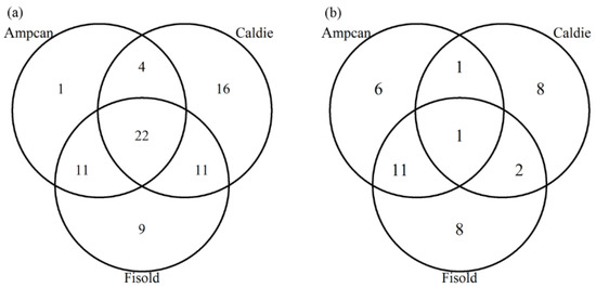 Venn diagram for the number of tree species associated with three liana species in a subtropical forest. Panel (a) shows the number for positive associations and panel (b) for negative associations.