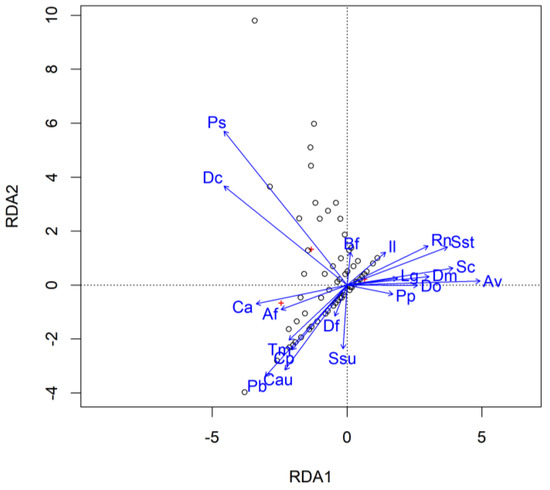 Redundancy analysis for the distribution of three liana species with respect to 20 tree species in a 20 ha subtropical forest dynamic plot in Chebaling (CBL), China. Tree species (explanatory variable), liana species, and sites are indicated by arrows, red crosses, and open circles, respectively. RDA axis 1 and 2 contributed to 68.3% and 19.1% of the variance explained by the model, respectively. Tree species: Ps: Phoebe sheareri; Dc: Daphniphyllum calycinum; Pb: Phoebe bournei; Ca: Choerospondias axillaris; Sc: Schoepfia chinensis; Tm: Tarenna mollissima; Lg: Lithocarpus glaber; Rn: Rapanea neriifolia; Do: Daphniphyllum oldhamii; Sst: Symplocos stellaris; Cp: Cinnamomum parthenoxylon; Av: Antidesma venosum; Pp: Photinia prunifolia; Il: Ilex lohfauensis; Ssu: Styrax suberifolius; Dm: Diospyros morrisiana; Bf: Beilschmiedia fordii; Cau: Cinnamomum austrosinense; Df: Diplospora fruticosa; Af: Alniphyllum fortunei.