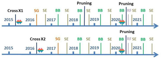 Timelines indicating the controlled crossings X1 and X2, the temperature treatments during the seed maturation (horizontal two-pointed arrow), seed germination, the phenological observations on the plants, the pruning of the plants, and the temperature treatment in 2020 (horizontal two-pointed arrow). SG: seed germination (orange lines); SE: leaf senescence (brown-green lines); BB: bud burst (green lines); RF: reflushing of dormant buds (light purple lines).