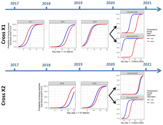 Modeled timing of bud burst of the seedlings from the crosses X1 and X2 for the first three (X1: 2017, 2018, and 2019) or first two (X2: 2018 and 2019) years after germination and during the spring temperature treatment in 2020, depending on the temperature during seed maturation.