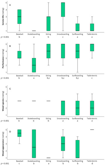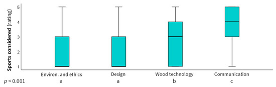 The “tradition” sub-dimension scored low ratings across all sports, although there are some differences. Tradition is a strong point of wood and its derived products in various applications, and in some cases new technologies are also functional in preserving its traditional uses [29]. However, the manufacturing of sport equipment is characterized by a strong and continuous search for performance and innovation [30]. This probably makes it preferable to avoid excessive reference to tradition, in order to maintain an overall image related to performance, development, technological updating, etc. In fact, more attention, at least to some extent, has been paid to innovation, especially by table tennis, followed by skiing, baseball, and snowboarding. The aspects highlighted by manufacturers vary within a broad range, e.g., in terms of new combinations of species, innovative shapes, improved bonding, or treatments. However, most research and development efforts seem to focus on other materials, which are considered more innovative and capable of complementing or replacing wood, even in its more typical applications [1].