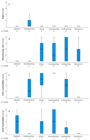 Results of the evaluation of the “Environment and ethics” dimension, and grouping (a–d) based on statistical analysis. The subfigures show the results of the various Sub-Dimensions, namely Origin (A), Manufacturing sites (B), Environmental sustainability (C), and Social sustainability (D).