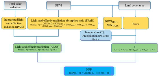 The Carnegie Ames Stanford Approach (CASA) model proposed by Potter effectively estimates the global NPP of vegetation [40]. The main input to the model are large-scale long-term remote sensing satellite data. In addition, the model takes full account of photosynthesis stress factors such as precipitation and temperature and is more suitable for monitoring the dynamic changes in the NPP of vegetation on a large scale [41]. The CASA model is the first light energy utilization model (PEM) to use light use efficiency (LUE) and has been widely applied [42]. The NPP calculation in the CASA model and the plant photosynthetic effective radiation (APAR) and actual light energy utilization (ε) are related (Figure 4).