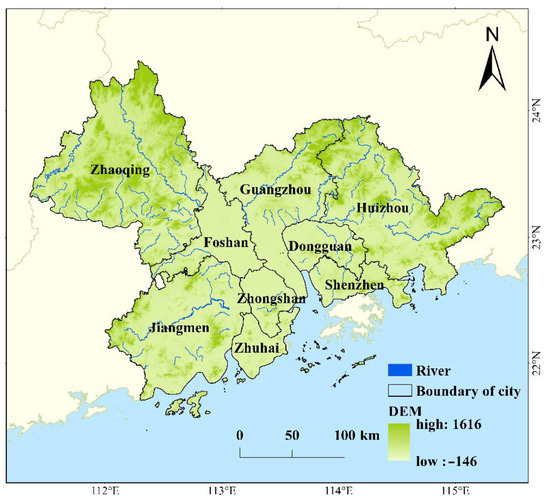 PRD (21.17°–23.55° N, 111.59°–115.25° E) is located in Guangdong Province on the southeast coast of China (Figure 1). It covers 55,368.7 km2 and is composed of nine neighboring cities such as Guangzhou and Shenzhen [25]. PRD has rapid economic development and a dense population. In 2020, the permanent population of the PRD was 78.24 million, and its gross domestic product (GDP) was 1.37 trillion USD, accounting for 62.09% and 80.49% of that of entire Guangdong Province, respectively. The population growth has exceeded 21 million over the past 10 years [26]. The urbanization rate of the PRD maintained an average annual growth rate of 0.8% even though the rate has reached 71.4% [27].