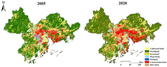 In 2005 and 2020, the main land-use types in PRD were woodland and cultivated land (Figure 2), which, in combination, accounted for more than 70% of the study area. Overall, in the study period, only the area of construction land and grassland increased, and other types of land use showed a downward trend (Table 2).