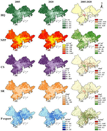 Our research evaluated the supporting services and regulating services of PRD before and after the establishment of NFC. In the past 15 years, except for the increase of NPP, the service capacity of other ESs mentioned in this study has decreased. The increase of NPP in the PRD is the same as the changing trend in the Yellow River source area [24]. Climate change is the main factor affecting NPP, and the increase of precipitation can improve the NPP of vegetation [25,42]. Rainfall data input for NPP calculation in this study showed that most months in 2020 were significantly rainier than those in 2005, which also corroborate the results of previous studies on the impact of precipitation changes on NPP.