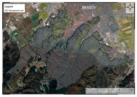The studied forest, with an area of 2923.6 ha, was located in the Postăvarul Massif of the Romanian Carpathians, in the proximity of Brașov city (Figure 1). The forest covered altitudes of between 700 and 1400 m. The most frequently encountered relief was slope, with inclinations of between 20 and 35º and varied aspects. The average multi-annual temperature of the studied area was between 5 and 7.8 °C, with precipitation between 750 and 950 mm. The forest has been integrated into a management unit and was characterized by a management plan that has been developed since 1890.