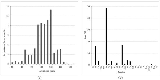 (a) Forest age structure and (b) proportion of species (% of area) identified in the forest composition. The age class division used was based on the ages of the trees of the different species. Each age class included generations of trees in the stands. Ai—Alnus incana L.; Aa—Abies alba Mill.; Cb—Carpinus betulus L.; Tilia—Tilia spp. L.; Pm—Pseudotsuga menziesii; Fs—Fagus sylvatica L.; Fe—Fraxinus excelsior L.; Qp—Quercus petraea L.; Ld—Larix decidua Mill.; Bp—Betula pendula Roth; Pa—Picea abies Karst.; App—Acer pseudoplatanus L.; Ps—Pinus sylvestris L.; Pn—Pinus nigra Arn.; Pst—Pinus strobus L.; Pt—Populus tremula L.; Rp—Robinia pseudoacacia L.; Qr—Quercus robur L.; Qru—Quercus rubra L.; Ulmus—Ulmus spp. L.; Ap—Acer platanoides L.; Pra—Prunus avium L.; Fo—Fraxinus ornus L. A fairly large percentage (71%) of the stands were over 100 years old. Species of this age, and occurring in the largest proportions, were beech, fir, and spruce. Sessile oak, pine, larch, sycamore, and other species were additions to these, in smaller proportions.