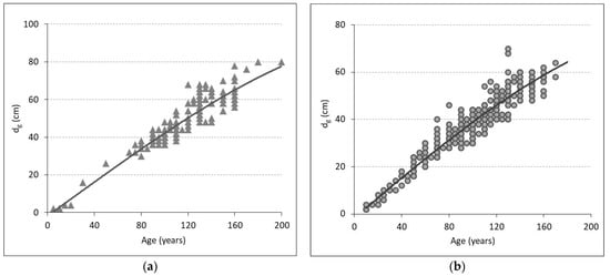 In this forest, the production of wood mass must also be taken into account. According to the management plan, the cutting age has been set at 120 years in the silvicultural system age class forest for the beech, mixed fir–beech, and mixed beech–coniferous stands. The sessile oak stands also reach 140 years old. In forests with protective functions, such as these, these ages can be increased by up to 20 years. At the age of 120 years, on high-productivity sites, the beech reached a diameter of 45 cm in the stands and the fir a mean diameter of 52 cm (Figure 3).