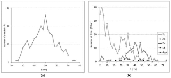 Number of trees vs. diameter distribution in (a) a beech stand (aged 140 years) and (b) a mixed beech–fir stand (aged 120 years). Fs—Fagus sylvatica L.; Aa—Abies alba Mill.; Pa—Picea abies Karst.; Ld—Larix decidua Mill.; App–Acer pseudoplatanus L. The beech stand had a greater variation in diameter. This was a closed stand (with a stand crown density of 1.0). Although it was a pure stand, the sizes of the trees and straightness and quality of the trunks made an impression. This stand is accessible on the tourist route, and is greatly appreciated and much-frequented by tourists. A young generation of trees was already developing in the mixed beech–fir stand, the young firs most often being in the seedling stage and growing vigorously, already providing 40% coverage. This is an accessible stand, positioned on the tourist route, and offering an illustration of the transition between generations resulting from management measures designed through management plans and applied by the forest district.