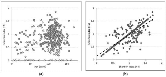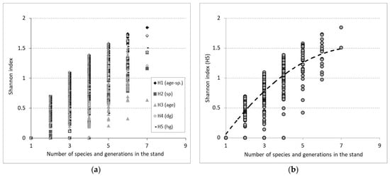 (a) Variation in the Shannon index (H5) in relation to stand age, and (b) Shannon diversity calculated at the level of the mean diameter and height of the stands.