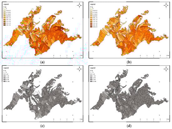 Stand distribution maps in relation to the (a) Hdg values, (b) Hhg values, (c) Esp. distribution, and (d) Edg values.