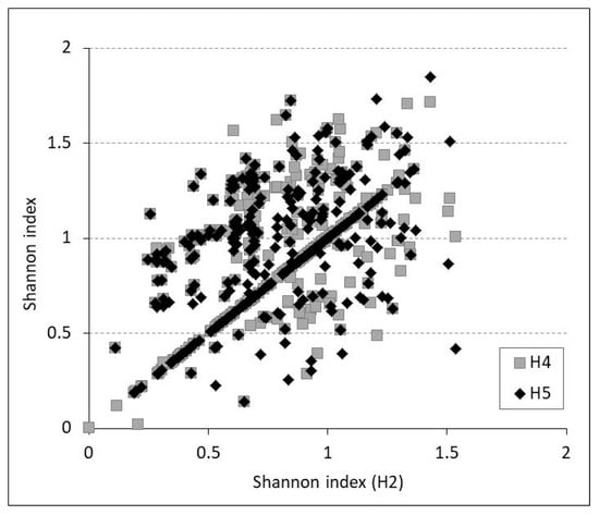 Relationship between diversity indices. In 49% (204) of the studied stands, it appeared that the increase in diversity in the stands in the vertical plane resulted from the increase in species diversity (H2).