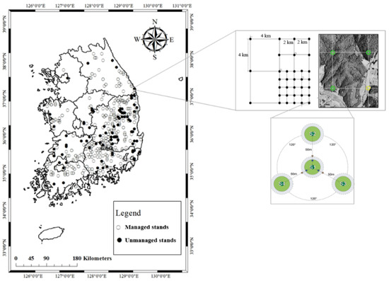 The National Forest Inventory has been collecting forest data as a national statistics project, through surveys performed every 5 years by the Korea Forest Service, since 1972 [25]. Through systematic cluster sampling, National Forest Inventory data comprise the permanent plots aligned in 4km × 4km intervals with four subplots in three directions at 0°, 120°, and 240° [26]. Among the permanent plots constructed in the past decade (2006–2015), the data for 1434 plots in pure forests in which Pinus densiflora stands accounted for ≥75% were extracted for use in the development of the model (Figure 1).