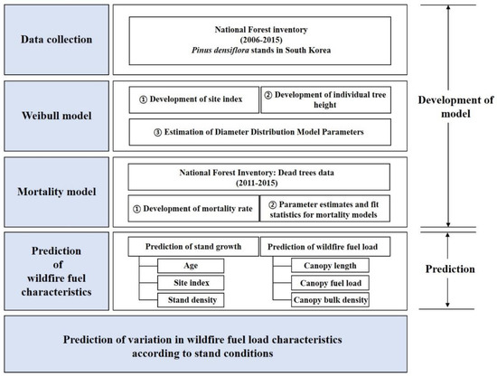 In the field of forestry, efforts have been made to establish a system to predict future forest structure and growth using the forest-growth model. Notably, the dynamic stand growth model is mainly used to predict the growth of various stands according to individual characteristics [17]. One such model is the Weibull-function-based diameter distribution model that can predict the tree density per diameter according to the stand characteristics. As the diameter at breast height (DBH) and tree density are critical factors in the estimation of combustible materials in a forest fire, the diameter distribution model is likely to be an important means of accurately predicting the variation in forest-fire fuel load.