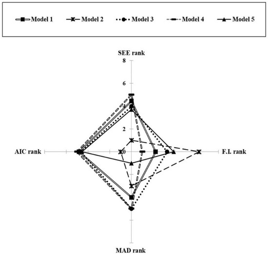 Rank analysis of the simple volume models using the validation dataset (note: the model with the smallest area inside the box represents the best model). AIC: Akaike information criterion; SEE: standard error of estimate; F.I.: fit index; and MAD: mean absolute difference.