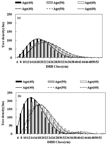 Predicted tree density in (a) managed stands and (b) unmanaged stands in each DBH class of the following stand ages: 40 years, 50 years, and 60 years.