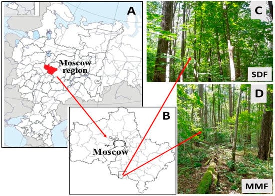 Location of the study sites. (A)—The European part of Russia; (B)—Moscow region; (C)—secondary deciduous forest (SDF); (D)—mature mixed forest (MMF).