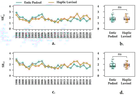 The values of SR*10 ranged from 1.15 to 2.86 gCm−2 day−1 in the sandy Entic Podzol and changed in the similar interval (1.10–2.65 gCm−2 day−1) in the loamy Haplic Luvisol over the 24-year observation period (Figure 5a). The interannual coefficients of variation and the oscillation coefficients for the SR*10 values in these soils amounted to 22%–23% and 0.88–0.97, respectively (Table S3, Supplementary Materials). The median value of SR*10 in the Entic Podzol was similar to that in the Haplic Luvisol. There was no significant difference between the mean values of SR*10 in both soils studied (Figure 5b).