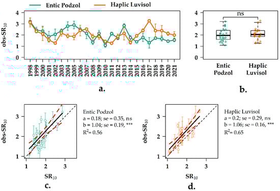 The values of obs-SR10 changed from 1.08 to 3.21 gCm−2 day−1 in the sandy Entic Podzol and from 1.26 to 3.28 gCm−2 day−1 in the loamy Haplic Luvisol (Figure 6a). During the first 8 years of observation (1998–2006), the obs-SR10 in the Entic Podzol was higher than in the Haplic Luvisol. This ratio was reversed between 2015 and 2021. There was a significant negative linear trend of obs-SR10 in the Entic Podzol during the measurement period (1998–2021), which equated to −0.51 gCm−2 day−1 per 10 years (R2 = 0.41; p < 0.001).