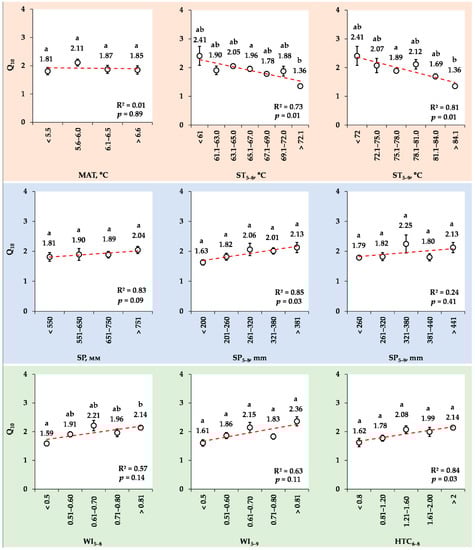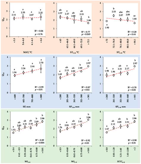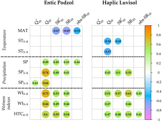 Rank correlations between the mean Q10 values in the loamy Haplic Luvisol and the meteorological indexes: MAT, °C mean annual Tair; ST5–8 and ST5–9 (°C) are the sums of the mean monthly Tair from May to August and May to September, respectively; SP is the annual sum of precipitation (mm); SP5–8 and SP5–9 are the sums of the monthly precipitation from May to August and May to September, respectively; WI5–8 and WI5–9 are the wetness indexes from May to August and May to September, respectively; HTC6–8 is the hydrothermal coefficient over the summer period (June–August). Letters indicate significant differences at p < 0.05.