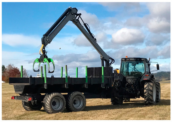 There are several different ways how to haul the felled timber from the stump to the roadside landing by primary transport. Typical representatives of timber primary transport in lowland areas are forwarders [8,9] or even adopted tractors, i.e., agricultural tractors with special four-wheeled trailers transporting the felled short timber from the logging site to the roadside landing. Foresters often prefer the use of agricultural tractors and trailers due to very low initial costs, cheap spare parts, easy availability and good maneuverability in a small area [10].