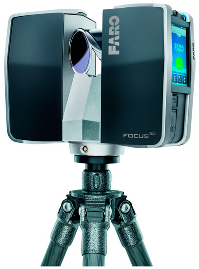 In this study, we employed one of the state-of-the-art methods for 3D data collection using pulse laser technology, which consists of measuring distance based on the calculation of the speed of laser beam pulse reflected from the scanned object—technology of terrestrial laser scanning (TLS). The measuring instrument used for the collection of data was terrestrial high-speed static panoramic scanner FARO Focus 3D (Figure 2) for detailed measurements whose method of determining the position of individual points, referred to as “Phase-Shift”, measures a phase shift between the constantly transmitted and received beam at a very high speed of recording. Depending on the resolution, the scanning rate can be up to 976,000 points per second. The distance is measured and recorded based on the calculation of the speed of the laser beam pulse reflected from the scanned object. Then, coordinates of individual points are obtained, which are determined by the polar method based on measuring the horizontal and vertical angles and the slant distance [30]. Thus, a great amount of 3D data of very high accuracy (spatial coordinates) can be obtained by evaluating and processing the measurements, whose output is a graphically spatial illustration of the studied object.