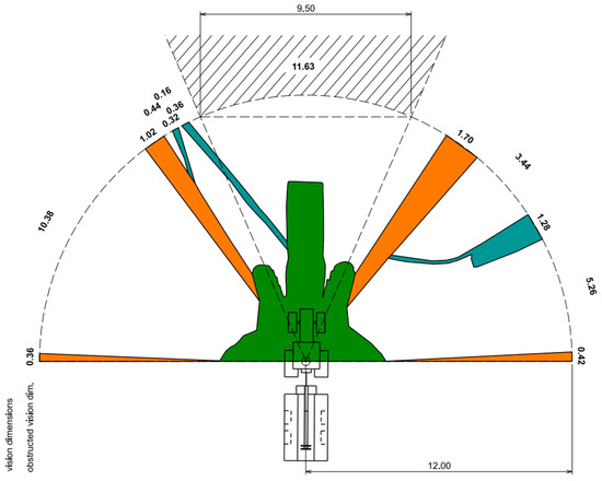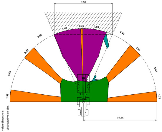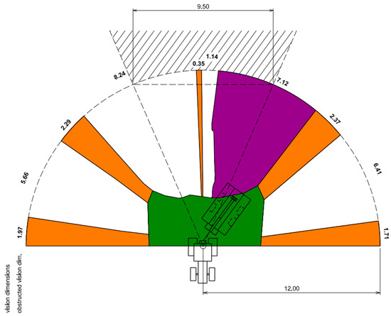 Output from the analysis processed by Bentley graphical software were floor plan schemes of the Valtra T 6300 agricultural tractor with the semicircular segment, the forward view sector (Figure 3) and the field of rear view (Figure 4 and Figure 5), created as an outer extension of the segment of semicircular view with a chord of 9.50 m in length. In the schemes, the chords of shading caused by fixed or movable structural parts of the machine and coupled trailer were provided as dimension figures. Dimensions along the semicircular segment are given in meters with accuracy to centimeters. Unfilled white areas illustrate visible parts of the operator’s (driver’s) view that are projected into the horizontal plane of the terrain. Colored areas represent areas shaded by the external structure (green), the fixed structural elements of the cabin (orange) and the movable structural elements of the machine (blue).