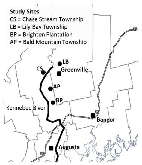 Study sites in central Maine, USA. Maine counties are shown along with the cities of Augusta and Bangor along Interstate 95. The three sites were designated as Chase Stream (CS on the map), Lily Bay (LB on the map), and Brighton Plantation (BP on the map). A comparison site described later is Austin Pond (AP on the map).