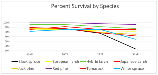 Survival: Percent survival of the original 16 test plot trees in each block (forks not included) is shown in Figure 2. Survival through age 27 of 80% or higher for all species was considered acceptable for further analysis. At age 27, there was no significant difference in survival between the species (α = 0.01). Only in the last measurement did we see a decline in the spruces. At age 34, only Black spruce had a significantly lower survival (α = 0.01) than the other species.