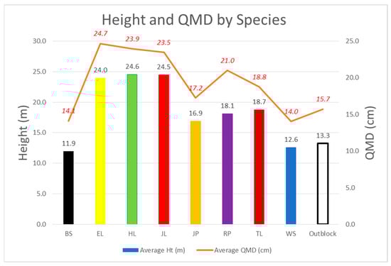 34-year average height and quadratic mean diameter (QMD). Bars and black data labels indicate height and the orange line with red italicized numbers indicates QMD for each species.