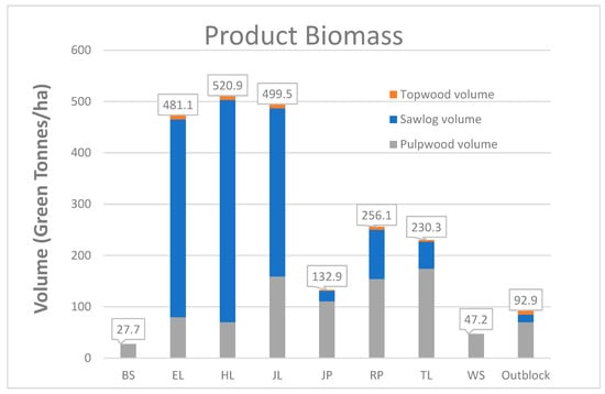 Merchantable green tonnes per hectare of weight by product class.