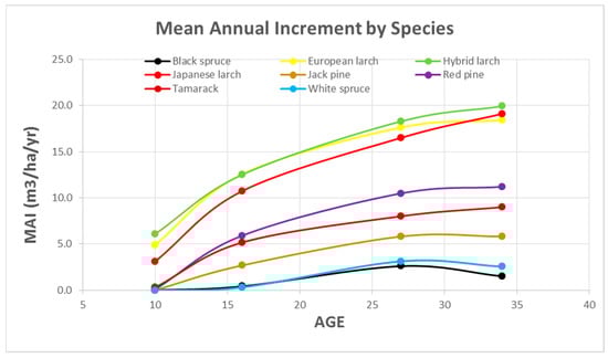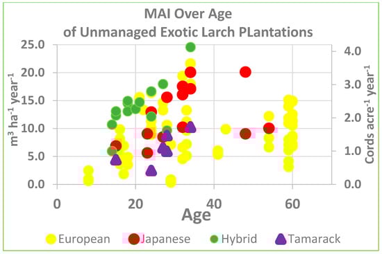 We also see that these reported volumes are not unique to this particular study. We have data from over 100 different sampled stands (Figure 11), some of which come from Gilmore [18] in Maine and northern New Hampshire. Mean annual increment (MAI) can range widely from just 5 to nearly 25 m3 ha−1 year−1. The average for the exotics is over 10 m3 ha−1 year−1, however for tamarack it is under 7 m3 ha−1 year−1. Gilmore et al. [10] discussed stocking standards for European larch.