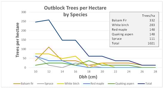 In the naturally regenerated outblocks, balsam fir (Abies balsamea (L.) Mill.), white birch (Betula papyrifera Marsh.), quaking aspen (Populus tremuloides Michx.), and red maple (Acer rubrum L.) made up the preponderance of the trees on these plots. Several balsam fir and quaking aspen grew to reach sawlog size class (23+ cm) (Figure 6).