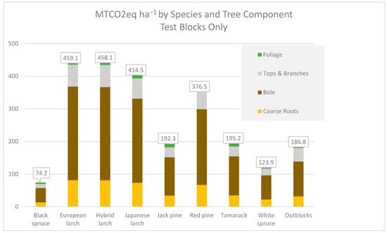Tree Carbon Dioxide equivalence: Shown as CO2 equivalence (Figure 7 based on statistically significant data shown in Table 4), the results show that exotic larches sequester more CO2eq than other species, with the hybrid taking the lead at nearly 460 MTonnes of CO2e ha−1 over the 34-year period. (The spreadsheet showing the calculated values is in Appendix A). Red pine accumulated 376 Mtonnes. Tamarack, the native larch, accumulated nearly 195 MTonnes. The outblocks, with measuring trees just 10.2 cm and larger at dbh, have accumulated nearly 187 Mtonnes in the 34 years since plantation establishment. By comparison, the Maine state-wide average is 204 MTonnes ha−1 for above and belowground tree carbon on timberland (from FIA data (USDA Forest Service [14]) calculating 25 tons acre−1 × 2.47 acres ha−1 × 0.91 Mtonnes ton−1 × 44 mass of CO2eq 12 mass of carbon−1).