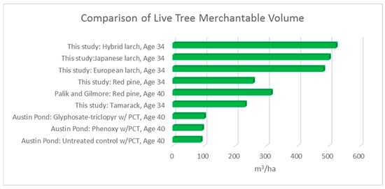 Comparison of merchantable volume (m3 ha−1), this study and others.
