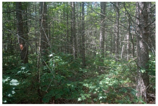 - Bataineh, M.M.; Wagner, R.G.; Weiskittel, A.R. Long-term response of spruce–fir stands to herbicide and precommercial thinning: Observed and projected growth, yield, and financial returns in central Maine, USA. Can. J. For. Res. 2013, 43, 385–395. [Google Scholar] [CrossRef]