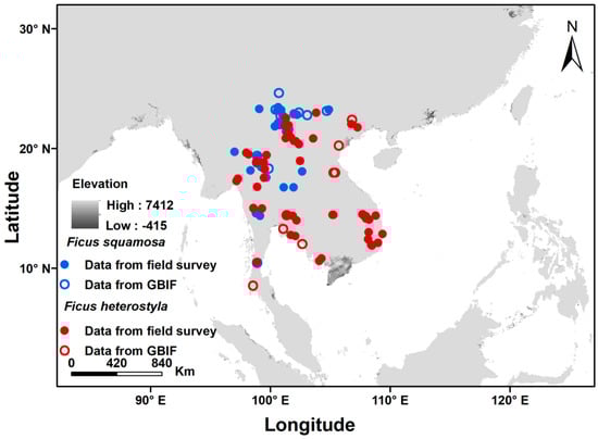 Ficus squamosa Roxb. (Subgenus Sycomorus, Section Sycocarpus) is distributed in Nepal, Bhutan, Sikkim, north-east India, Myanmar, Laos, and China (Yunnan), while F. heterostyla Merr. (Subgenus Sycomorus, Section Hemicardia) is distributed in Thailand, Vietnam, Laos, and Cambodia [37]. Both Ficus species show overlapping distributions in the Xishuangbanna region of China and share an undescribed pollinating fig wasp (Ceratosolen sp.) [28]. From 2008 to 2018, we conducted several field surveys and sample collections in China, Laos, Myanmar, Vietnam, Cambodia, and Thailand (98.5° E–109.5° E and 9.5° N–26.5° N). We investigated the distributions of both species referring to the Flora of Thailand [37] and Flora of China [38], as well as other potential parts of their ranges. We recorded 143 occurrences for F. squamosa and 257 occurrences of F. heterostylla in natural conditions, during April of 2008, April of 2014, and February of 2018 in China, June of 2013 in Vietnam, April of 2015 in Cambodia, October of 2016 in Myanmar, January of 2012, July of 2013, August of 2014, and March and October of 2018 in Thailand, and October of 2018 in Laos. We also downloaded the distribution data of both species from the Global Biodiversity Information Facility (GBIF) website (https://doi.org/10.15468/dl.m8cqz7, accessed on 21 August 2022), including 16 records for F. squamosa and nine records for F. heterostyla. All data obtained were exported to ArcGIS v10.5, with and duplicate presence data within 1 km removed, involving 104 points for F. squamosa and 199 points for F. heterostyla. Finally, the distribution data of the two sympatric species included 55 records of F. squamosa and 67 records of F. heterostyla (the source and distribution of all records are provided in Figure 1 and Table S1 in Supplementary Materials). We retained these records to match climate variables for further model analysis.