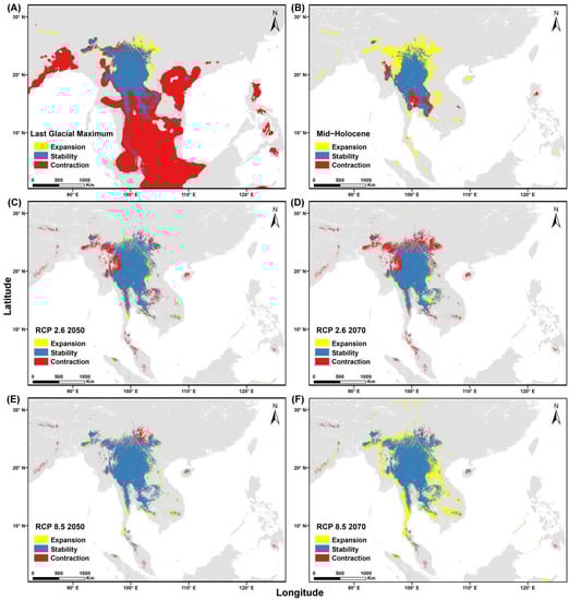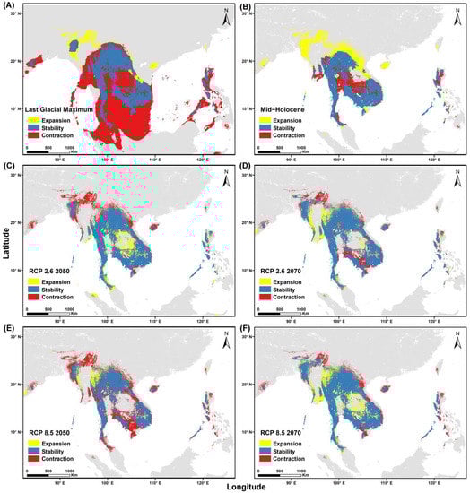 From past to current (red areas indicate areas previously suitable and lost by the present period) and from current to future (red areas indicate areas currently suitable which will be lost), the expanded and contracted range of F. squamosa. (A) Last Glacial Maximum (LGM), (B) Mid-Holocene, (C) future (RCP 2.6 2050), (D) future (RCP 2.6 2070), (E) future (RCP 8.5 2050), and (F) future (RCP 8.5 2070).
