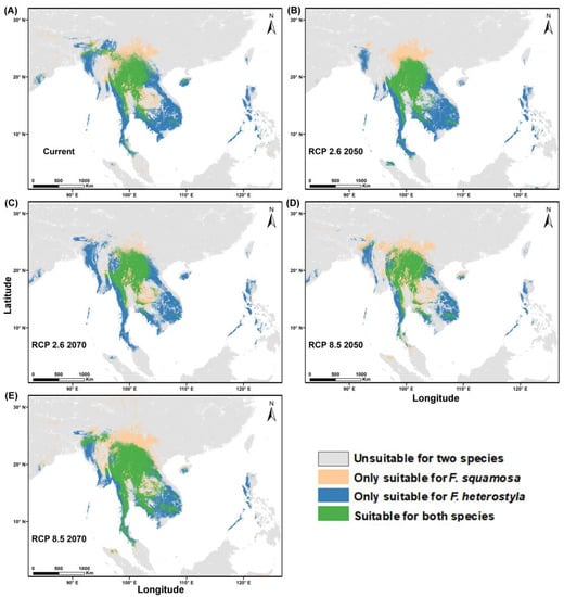 During the LGM, both species had larger distribution areas than during the Mid-Hol and current period, as large portions of the now submerged Sunda shelf were suitable. Future projections for 2050 and 2070 suggested that regions from southern China to northern Thailand would still exhibit high habitat suitability potential for F. squamosa and F. heterostyla, but habitat suitability for both species would reduce overall across the whole study area, although some expansions may occur in 2070.