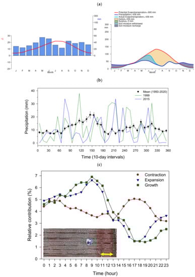 Temporal scales (month, 10-day intervals, hours) considered in the study of climate–IADFs relationships. Correlations were calculated considering (a) monthly, (b) 10-day, and (c) hourly climate data. In plot (a) the climate diagram of Daroca station showing typical Mediterranean conditions is presented with estimates of monthly potential evapotranspiration. In plot (b) symbols show mean (± SE) precipitation values and color lines show precipitation values in this station for years with a high frequency of IADFs (1999, 2015). In plot (c) the hourly phases of stem contraction, expansion, and assumed growth were obtained from dendrometers attached to a P. halepensis tree in the Peñaflor site (see Table 1). The image in (c) shows a latewood IADF (yellow arrow) in a cross-section showing an annual ring of P. halepensis.