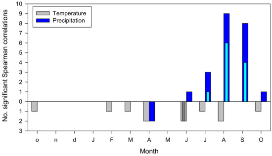 Summary of climate–IADF relationships calculated at monthly scale in the six study tree species. Monthly climate variables are mean temperature (grey bars) and precipitation (blue bars). Months abbreviated by lowercase and uppercase letters correspond to the previous and current years, respectively. Wide and narrow bars correspond to Spearman correlations coefficients (rs) with significance levels lower or equal to 0.05 and 0.01, respectively.