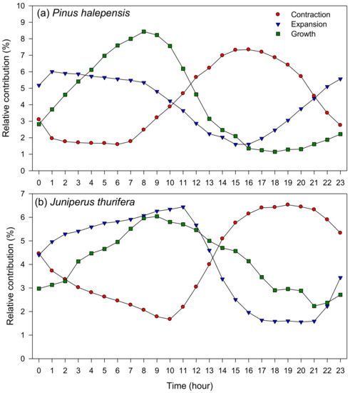 At hourly resolution, the highest relative contribution to growth occurred from 7 to 9 h and from 7 to 12 h in P. halepensis and J. thurifera, respectively (Figure 5 and Figure S9). Expansion also peaked in the night, whereas contraction was mainly observed from 14 to 17 h and from 16 to 21 h in P. halepensis and J. thurifera, respectively. Conditions favorable for growth were observed during night in both species, from 20 to 2 h and from 6 to 8 h (Figure 6 and Figure S10).