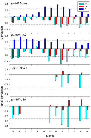 I used Pearson correlations and partial correlations to assess the relationships between monthly climate variables (mean minimum and maximum temperatures, precipitation) and growth rates (chronologies or mean series of ring-width indices) in the two sites from north-eastern Spain and south-western USA. Partial correlations were calculated between minimum and maximum temperatures to disentangle the relative contributions of each variable to explain year-to-year growth variability. Partial correlations were calculated only for months when either minimum or maximum temperatures showed significant (p < 0.05) correlations with ring-width indices. Correlations were calculated considering the window from prior to current October and the common 1950–2016 period.
