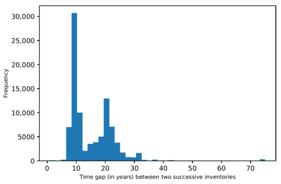 The goal of this study is to simulate growth dynamics recursively, i.e., we want to predict the state of a division at date from its state at date . This is a pragmatic approach that is well suited to the development of the model and its use in practice. The duration does not need to be constant (see Section 3), but it must be within an interval whose definition meets two constraints: (i) the possibility of finding data describing dynamics over such periods; (ii) the relevance of these durations for a use of the model as a decision support in practice. Figure 2 shows that the available data correspond to durations from 8 to 26 years. However, this interval is too wide for model development. The diameter data are given in 5 cm diameter classes. For a relatively large annual diameter increase of 5 mm·year−1, a tree takes 10 years to completely cross a diameter class. Over a period of 20 years and more, with such an increase, a tree can pass through two or more diameter classes. The growth mechanisms in the sense of recursive modeling cannot therefore be the same over these two types of periods. We choose to focus on durations of up to 12 years. This interval allows the model to be used over a sufficiently long period to assist in planning the next cut, and it is possible to use the models recursively to simulate dynamics over longer periods. Data corresponding to gaps of more than 12 years between two successive inventories are left out, so that only 52% of couples (division, inventory year) that had been retained until then are kept.