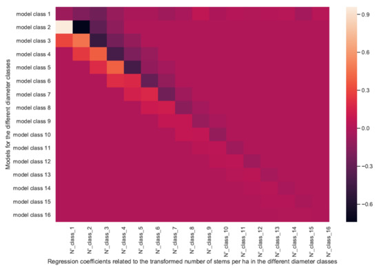 The regression coefficients corresponding to the training on the whole data set are presented in Table A3 in Appendix B and are shown in Figure 3 as a heatmap for ease of exposition and interpretation. Because of the transformations undergone by the variables (Yeo-Johnson and standard scaling, for each diameter class separately), the coefficients are difficult to interpret in absolute terms, but their sign can be interpreted, as can their relative values within a given model.