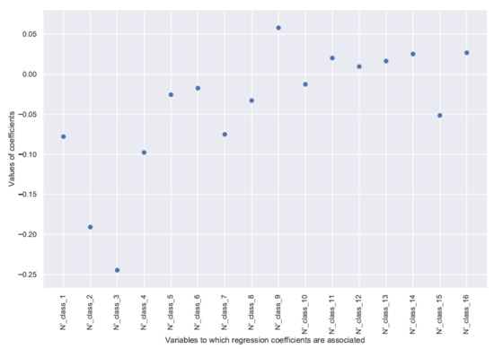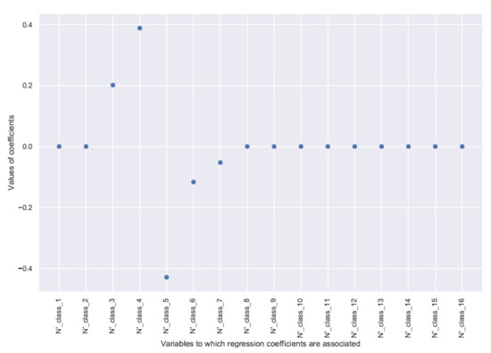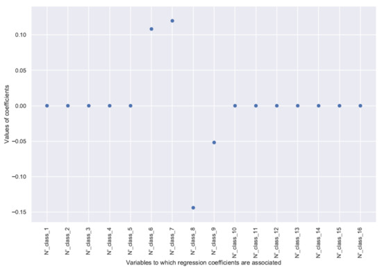 For class 1, the situation is different for the reasons already stated, which have to do with the lack of information on the underlying classes. In this case, the model performed better by keeping all features corresponding to the overlying classes. Figure 6 shows the value of the regression coefficients associated with features (see Equation (7)) for the diameter class 1 model.
