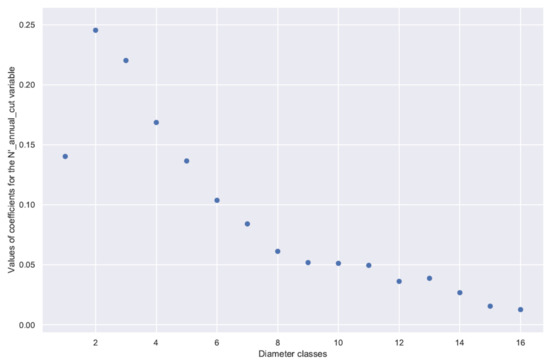 For diameter classes greater than 1 (diameters greater than 22.5 cm), a common pattern is visible. This pattern is similar to the results presented in [13], despite the differences due to our data transformations. This pattern is also clearly visible when displaying the coefficients for a given model on a graph, see for example, Figure 4 and Figure 5.