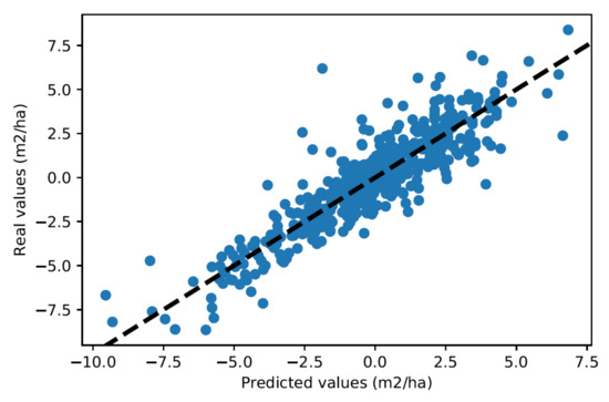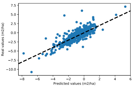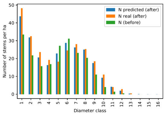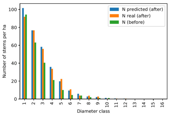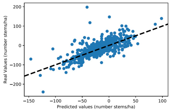 The results for the predictions of are satisfying except for class 1 (). Since there are no data on the number of stems for diameter classes below 17.5 cm, it is impossible to precisely predict the number of trees that will enter class 1 during the growth period, i.e., the recruitment rate of our set of models, hence the limited performance. For the other models, test R2s range typically from 50% to 70%. These models manage to predict most of the variance of the based on the initial state of a division (and on cuts and windfalls ) for cases that were not used for training the model. Using these predicted increments (after inverse transformation) to predict stem counts at the end of the growth period also produces satisfying results, mechanically better than the prediction of increments since the initial stem counts are known and largely explain the stem counts 7 to 12 years later. All diameter classes combined, the models predict future stem numbers with a test R2 of 90.3%. The root mean squared error (RMSE) indicates the average difference between predicted values and real values in absolute terms. It is here computed on real and predicted values and can be compared to mean real values of . Table 2 shows that RMSE values are satisfyingly small compared to mean values, although performances decrease noticeably for diameter classes above 10 ( and are mediocre for diameter classes above 13 (). These figures can be compared to the result obtained with the artificial neural network approach (see below).