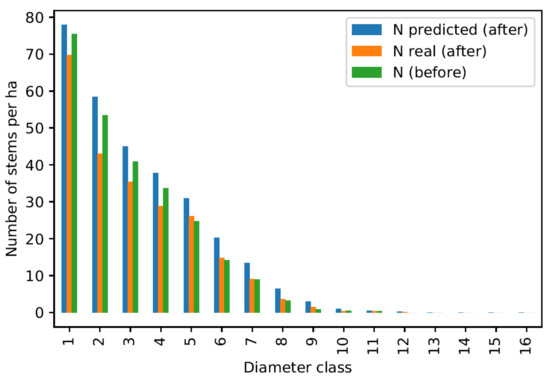 Stand-level models aim at predicting the increment of a key stand-level variable, typically the increment of the standing volume or basal area. The recent literature has seen the publication of several such studies based on machine learning methods and data from permanent plots [6,7,8]. In particular, some of these studies use artificial neural networks among other regressors [7,8]. All of these models achieve good predictive performance and can be useful in practice, e.g., in management systems where harvested volumes are planned on the basis of increments. However, they do not provide information on stand structure.